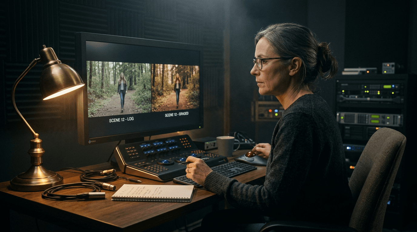 [IMAGE PROMPT: cinematic still, ultra photorealistic, shot on ARRI Alexa 65, anamorphic lens, shallow depth of field, film editor in dim grading suite comparing two frames on calibrated monitor, warm practical lamp, natural skin texture, subtle imperfections, film grain, volumetric lighting, realistic color grading, no CGI look, no artificial sharpness --ar 16:9]