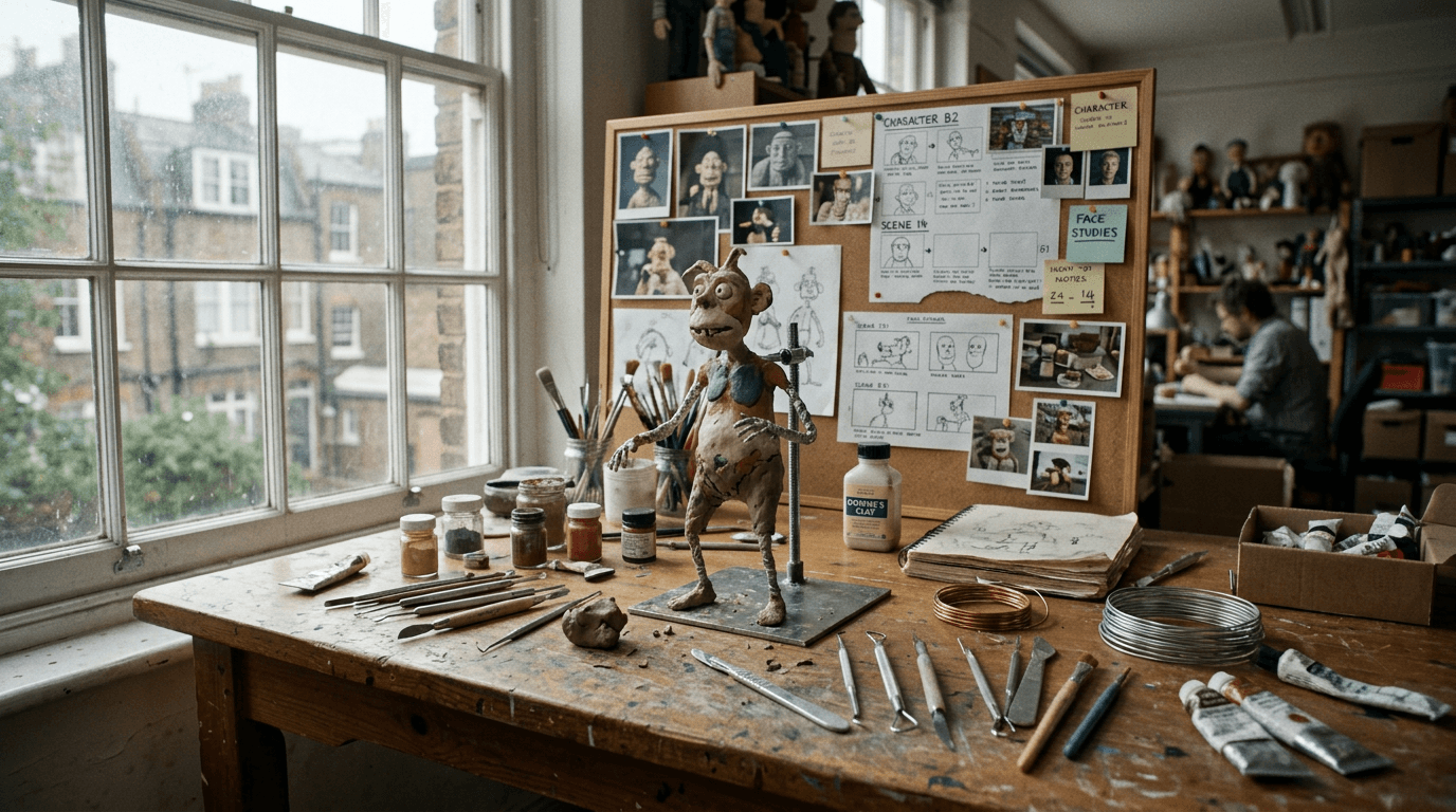 Prompt: cinematic still, ultra photorealistic, shot on ARRI Alexa 65, anamorphic lens, shallow depth of field, small animation sculptor workspace, maquette on stand, tools and reference photos, soft overcast window light, dust in air, worn wooden desk, natural textures, subtle imperfections, film grain, volumetric lighting, realistic color grading, no CGI look, no artificial sharpness --ar 16:9